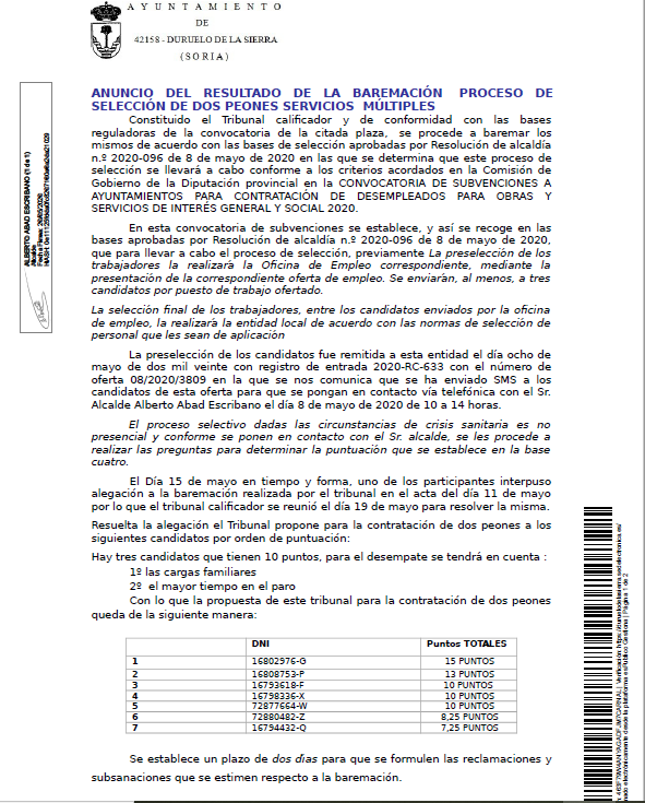ANUNCIO RESULTADO BAREMACIÓN SELECCIÓN PEONES DE SERVICIOS MÚLTIPLES