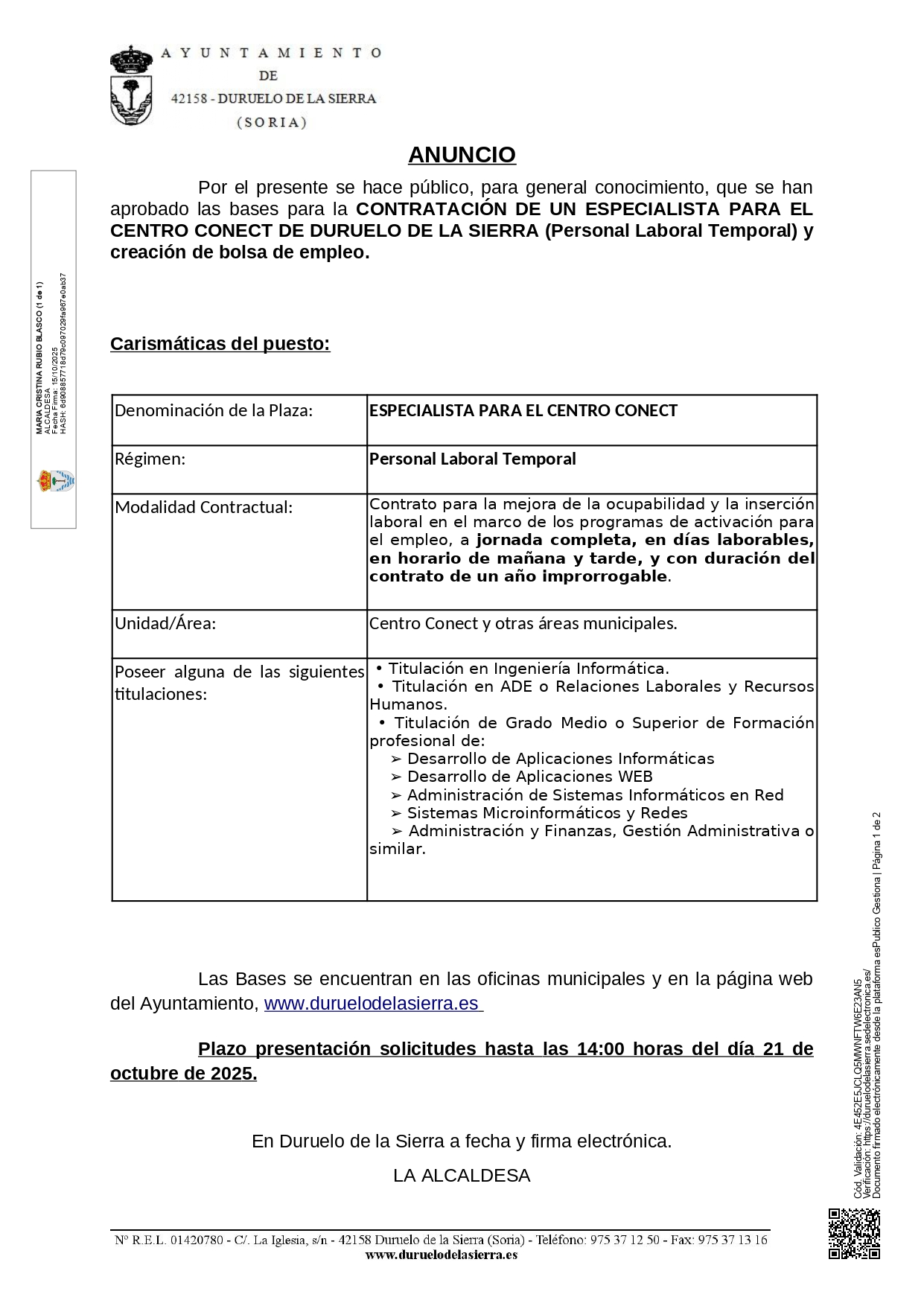 BASES DE LA CONVOCATORIA PARA LA CONTRATACIÓN DE UN ESPECIALISTA PARA EL CENTRO CONECT - PLAZO DE PRESENTACIÓN SOLICITUDES LAS 14:00H DEL 21 DE OCTUBRE