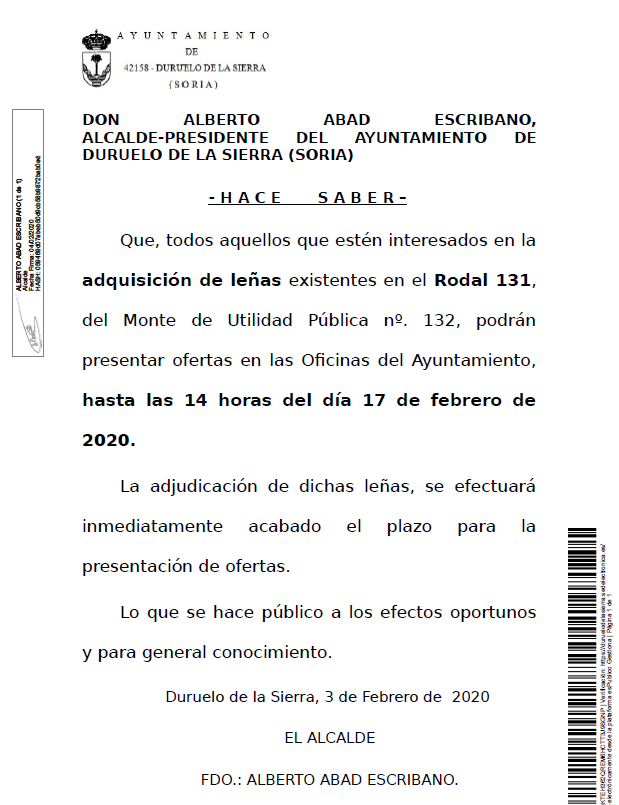 INTERESADOS EN LA ADQUISICIÓN DE LEÑAS EXISTENTES EN EL RODAL 131, DEL MONTE DE UTILIDAD PÚBLICA Nº. 132, PODRÁN PRESENTAR OFERTAS EN LAS OFICINAS DEL AYUNTAMIENTO, HASTA LAS 14 HORAS DEL DÍA 17 DE FEBRERO DE 2020.