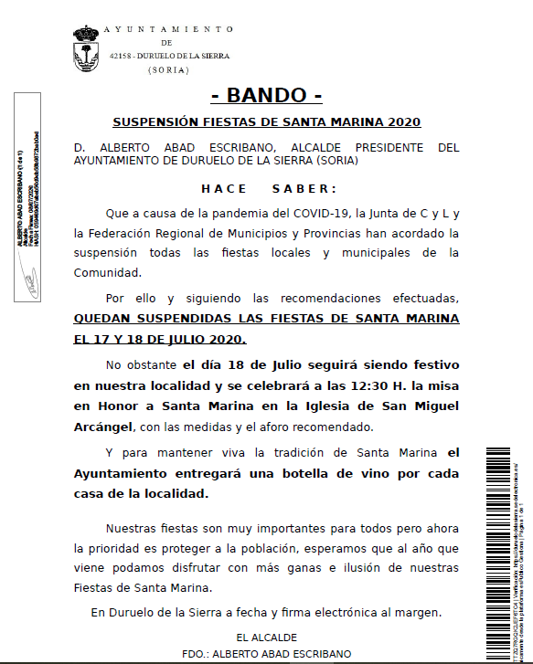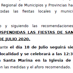SUSPENSIÓN FIESTAS DE SANTA MARINA 2020 POR COVID19